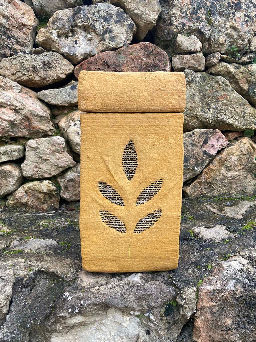 Matières et techniques : Contenant ou urne réalisée à partir de dentelle de carton et de carton alvéolé, enduit intérieur et extérieur de carton broyé mêlé à de l’ocre jaune/ rouge d’Apt et de la colle d’amidon